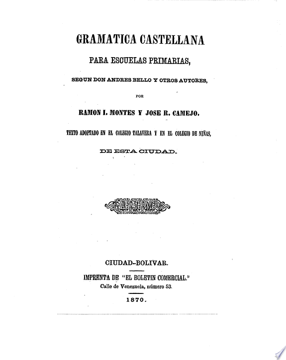 [E]scojió la Gramática de la lengua castellana por Don Andres Bello, reimpresa, de la primera edicion de Santiago de Chile, en el establecimiento tipográfico del señor Valentin Espinal... [pero] su obra se resiente de cierta falta de método para la enseñanza; lo cual impone al maestro, y exige del discípulo, una contraccion y un trabajo, que hacen difícil la enseñanza y duro el aprendizaje.